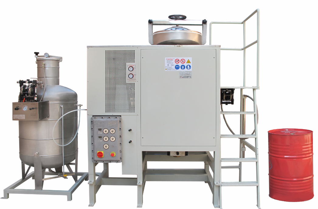 ④在分离回收过程结束后,可利用真空减压装置的排料功能,将剩余纯净药水液体排到所需的容器中。待回收机降温时,再打开桶盖,将回收机倾倒,将内部的药水液体倒出并清理干净。如剩余药水液体混杂粉尘、油泥较多时,可采用物理方式过滤去除。