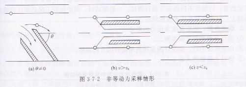 图3-7-2中是非等动力采样的情形。其中a取样头与气流有一交角θ,烟气气流虽保持原来速度,但方向改变了,由于颗粒具有惯性,它与气流的运动发生偏差,因此原来样品中的颗粒不能随烟气进入采样头;图3-7-2b的取样头虽与烟气流线平行,但抽气速度超过了样品原来速度,由于惯性作用,采样体积中的颗粒物并没有全部进入采样头;3-7-2c的取样头内速度低于烟气速度,导致样品体积以外的颗粒进行采样头,由此可见,等动和采集对采集有代表性的样品是非常重要的。