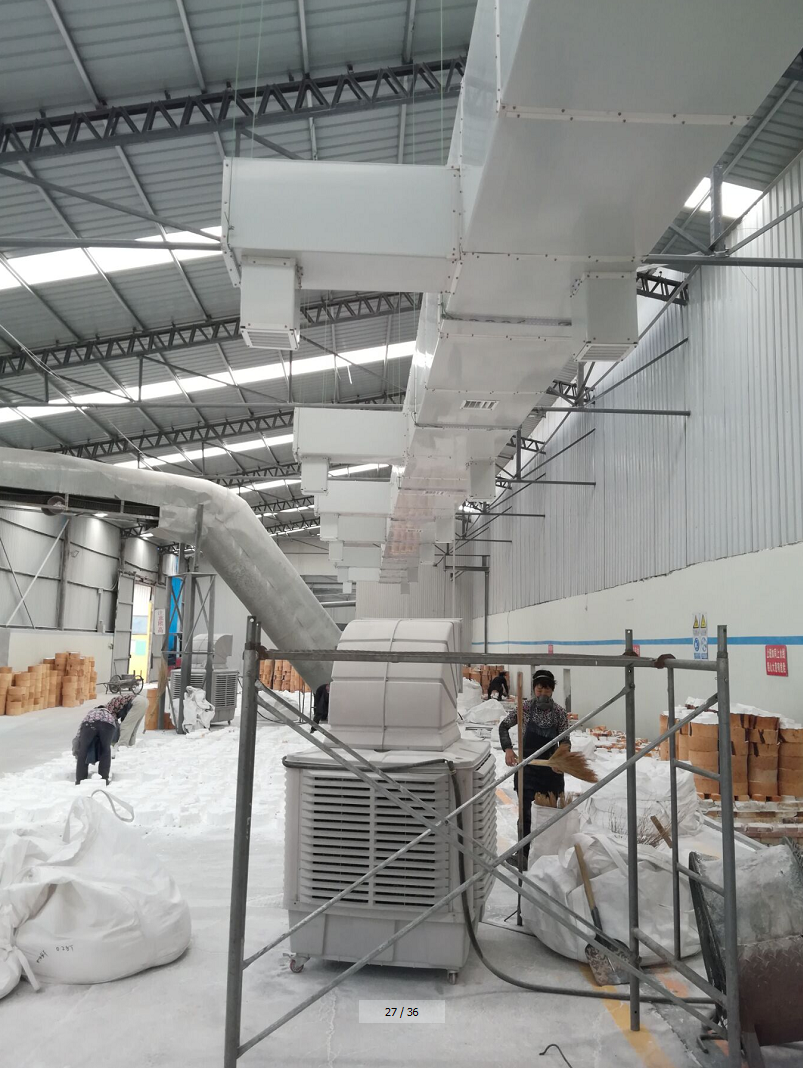 湖北某轮胎生产厂通过网络平台找到我们公司,在该公司看过我们给出的专业车间降温解决方案,又考察了我们公司做过环保空调降温的轮胎厂,终对整体方案、综合能力非常认可,选择与我公司合作。我公司业务人员、技术人员现场勘察后,特采用车间降温湿帘冷风机机组30台,设计机组在车间顶部平均分布安装,底部连接通风管道短接向下送风,机组运转将新鲜的冷空气输送到车间内部。经测试车间内温度降低10度左右,效果明显。